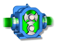 雙螺桿泵與齒輪泵十分相似,一個(gè)螺桿轉(zhuǎn)動(dòng),帶動(dòng)另一個(gè)螺桿,液體被攔截在嚙合室內(nèi),沿桿軸方向推進(jìn),然后被擠向中央排出。